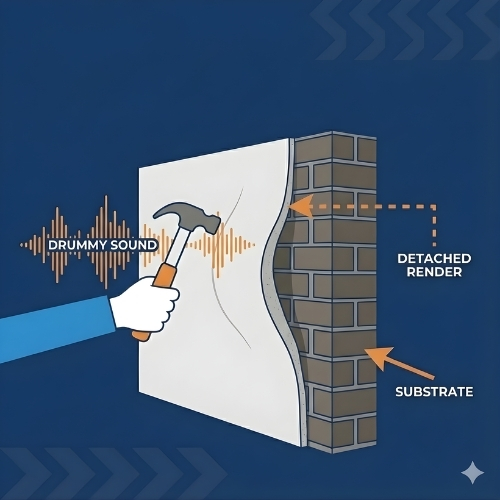 When render becomes loose or delaminated, it creates hollow areas that compromise facade safety, durability, and compliance. Over time, this can lead to falling render risks, moisture penetration, accelerated facade deterioration, and escalating remediation costs.