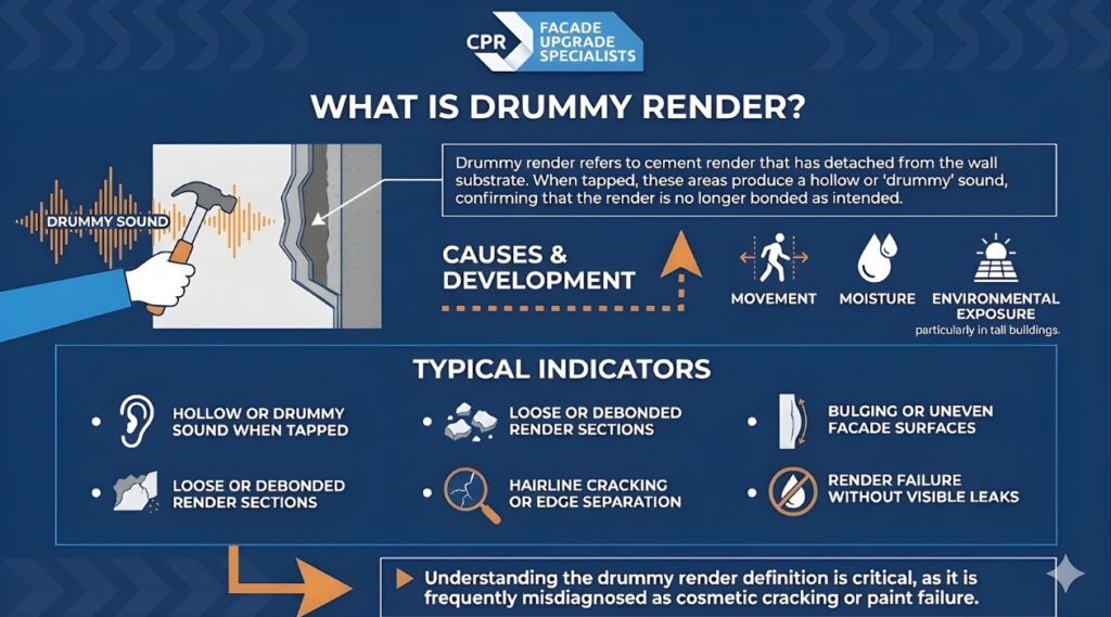 In high‑rise and strata buildings, drummy loose render commonly develops on external walls where environmental exposure and building movement are greatest.